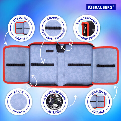 Тканевый пенал BRAUBERG стандартного размера с одним отделением и двумя откидными планками. Удобная молния с трех сторон с металлическим бегунком, прочные резинки для предметов. Вмещает до 35 предметов.