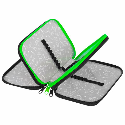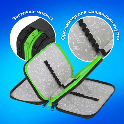 Пенал ПИФАГОР яркого дизайна с тремя отделениями выполнен из ламинированного картона, имеет тканевый торец. Оснащен удобными молниями с металлическими бегунками с трех сторон, а также прочными резинками для фиксации предметов. Вмещает до 42 предметов.