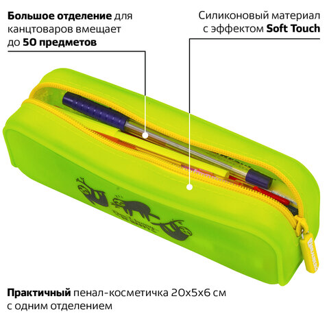 Пенал-косметичка BRAUBERG "Sloths" выполнен из нетоксичного гипоаллергенного силикона с эффектом Soft Touch. Контрастная молния оснащена силиконовым бегунком с логотипом. Вмещает до 50 канцелярских предметов стандартного размера.