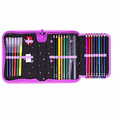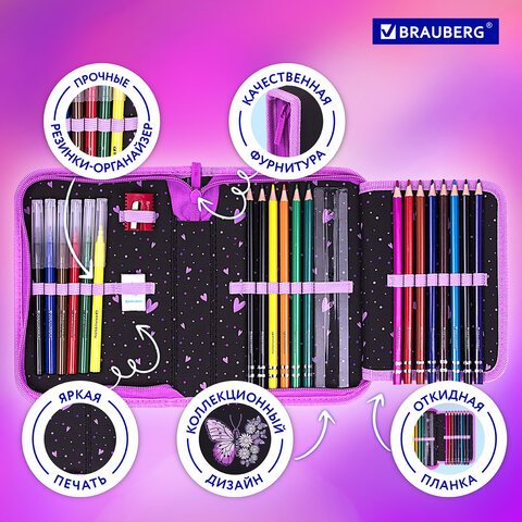 Пенал BRAUBERG с наполнением, 1 отделение, 1 откидная планка, 24 предмета, 21х14 см, "Flower butterfly", 271524