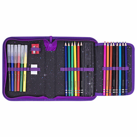 Пенал BRAUBERG с наполнением, 1 отделение, 1 откидная планка, 24 предмета, 21х14 см, "Neon cat", 271523