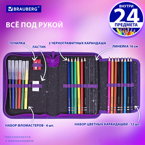 Тканевый пенал BRAUBERG стандартного размера с одним отделением и одной откидной планкой. Удобная молния с трех сторон с металлическим бегунком, прочные резинки для предметов. Пенал с наполнением включает 24 предмета.