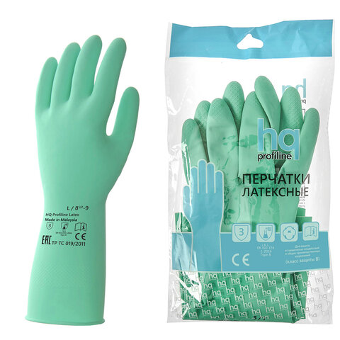 Перчатки латексные КЩС, сверхпрочные, плотные, хлопковое напыление, размер 8,5-9, L (большой), зеленые, HQ Profiline, 73586