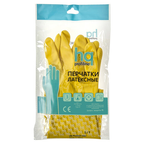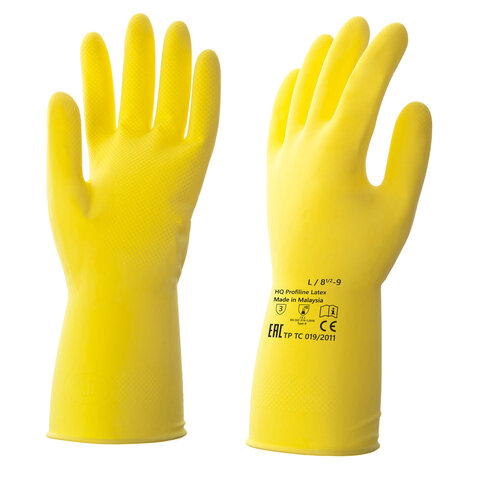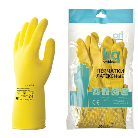 Перчатки латексные КЩС, сверхпрочные, плотные, хлопковое напыление, размер 8,5-9, L (большой), желтые, HQ Profiline, 73587