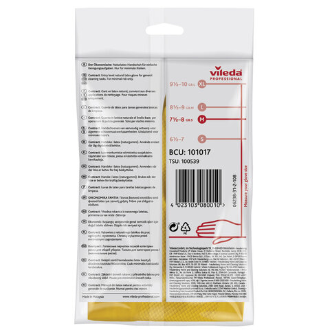 Прочные перчатки VILEDA "Контракт" для общей уборки из натурального латекса. Комфортные (внутри хлопковое покрытие), эластичные, долговечные. Повышенная чувствительность в области пальцев.