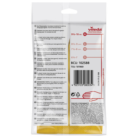 Прочные перчатки VILEDA "Контракт" для общей уборки из натурального латекса. Комфортные (внутри хлопковое покрытие), эластичные, долговечные. Повышенная чувствительность в области пальцев.