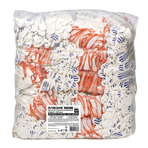 Перчатки хлопчатобумажные, КОМПЛЕКТ 200 пар, 10 класс, 32-34 г, 83 текс, ПВХ точка, LAIMA БЮДЖЕТ, БЕЛЫЕ, 601912