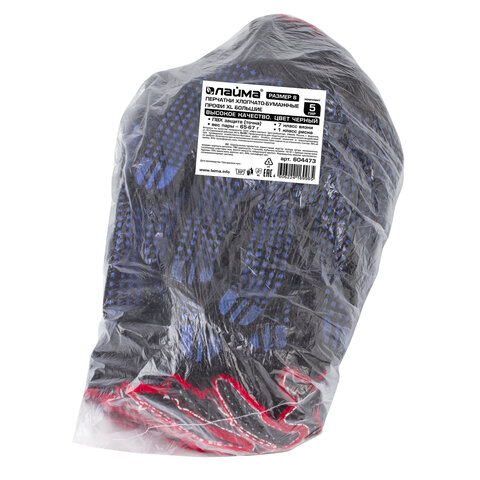 Перчатки хлопчатобумажные, КОМПЛЕКТ 5 ПАР, 7 класс, 65-67 г, 216 текс, ПВХ-точка, LAIMA "ПРОФИ" XL, черные, 604473