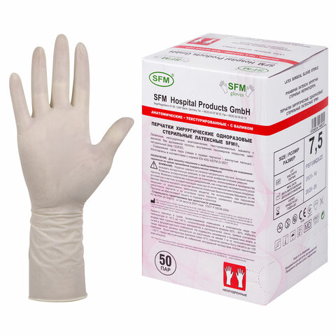 Перчатки латексные стерильные хирургические, КОМПЛЕКТ 50 пар (100 штук), Германия, размер 7,5, М (средний), SFM