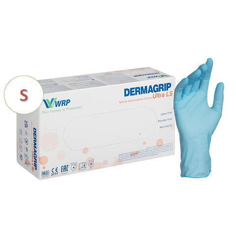 Перчатки нитриловые смотровые, 100 пар (200 штук), повышенная чувствительность, размер 6-7, S (малый), DERMAGRIP Ultra, D1101-27