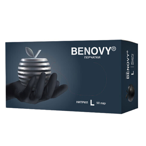 Перчатки нитриловые смотровые 50 пар (100 штук), размер 8-9, L (большой), черные, BENOVY MultiColor, ЧЗ
