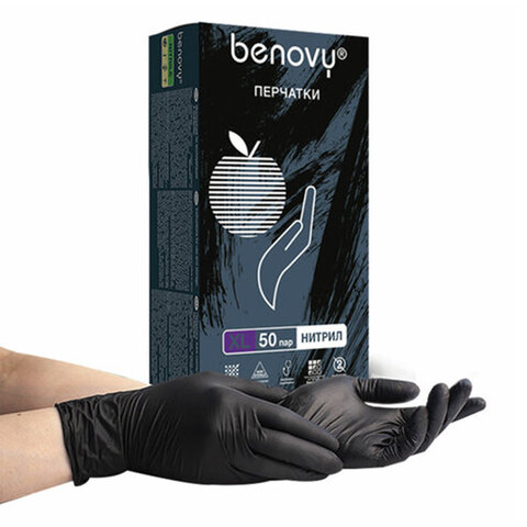 Перчатки нитриловые смотровые 50 пар (100 штук), размер 9-10, XL (очень большой), черные, BENOVY MultiColor