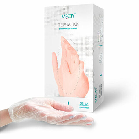 Перчатки виниловые смотровые 50 пар (100 штук), размер 8-9, L (большой), прозрачные SAF&TY