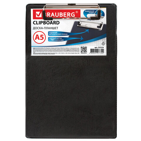 Доска-планшет МАЛЫЙ ФОРМАТ (158х230 мм), А5, BRAUBERG "NUMBER ONE "с прижимом, картон/ПВХ, ЧЕРНАЯ, 232224