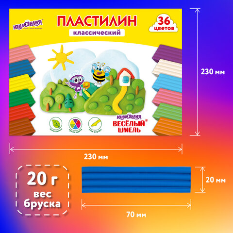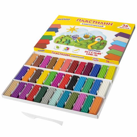 Пластилин классический ЮНЛАНДИЯ "ВЕСЁЛЫЙ ШМЕЛЬ", 36 цветов, 720 грамм, СО СТЕКОМ, ВЫСШЕЕ КАЧЕСТВО, 106434