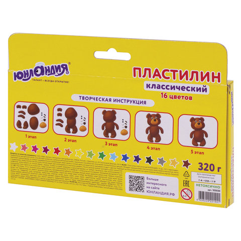 Пластилин ЮНЛАНДИЯ предназначен для лепки дома и на уроках труда. Занятия с классическим пластилином способствуют развитию воображения и мелкой моторики рук ребенка. Творческая инструкция по лепке представлена на обороте.