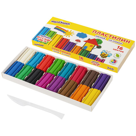 Пластилин мягкий ЮНЛАНДИЯ "ВЕСЕЛЫЙ ШМЕЛЬ", 16 цветов, 240 г, СО СТЕКОМ, 106673