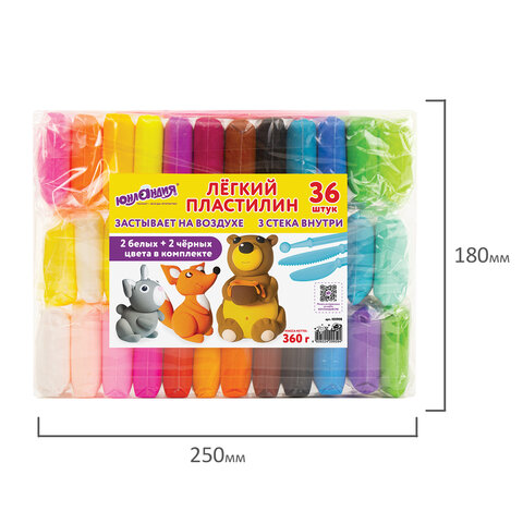Пластилин супер лёгкий воздушный 36 шт. (32 цвета + 2 белых + 2 черных), 360 г, 3 стека, ЮНЛАНДИЯ, 105908