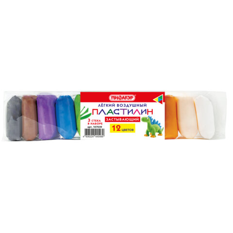 Пластилин супер лёгкий воздушный застывающий 12 цветов, 110 г, 3 стека, ПИФАГОР, 107039