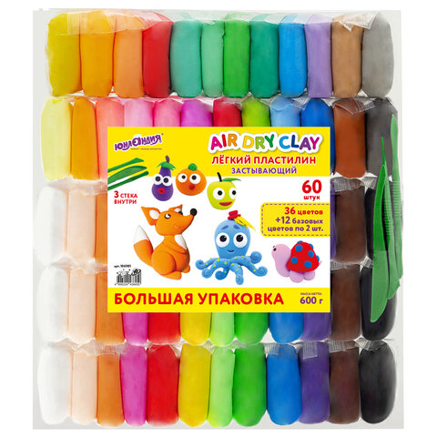 Пластилин супер лёгкий воздушный застывающий 60 штук (36 цветов + 12х2 базовых), 600 г, 3 стека, ЮНЛАНДИЯ, 106981