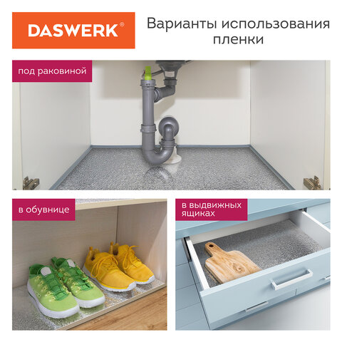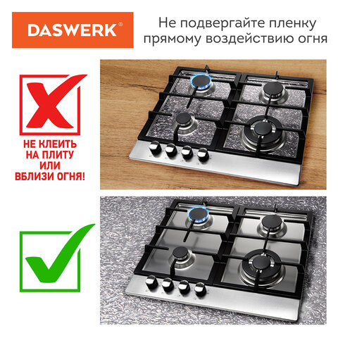 Самоклеящаяся плёнка DASWERK из прочного композитного материала с содержанием алюминия не впитывает воду, масла, жиры и эффективно используется в качестве защитного или декоративного покрытия для кухни и других рабочих зон.