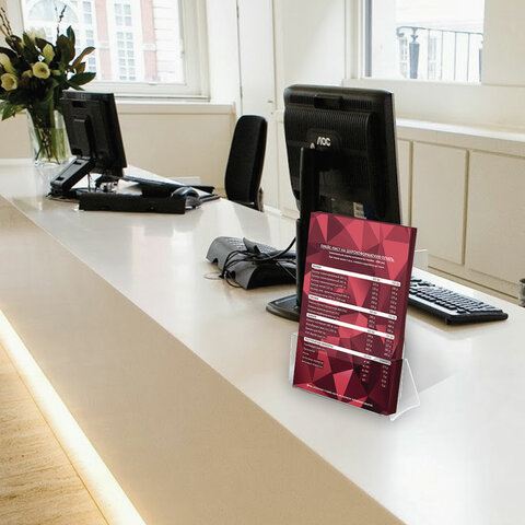 Вертикальная настольная подставка STAFF с высоким бортом. Благодаря широкому основанию, вмещает сразу несколько листовок или буклетов формата А4.