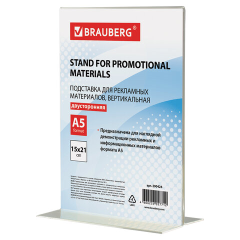 Двусторонняя вертикальная настольная подставка BRAUBERG подходит для размещения меню, рекламных материалов формата А5.