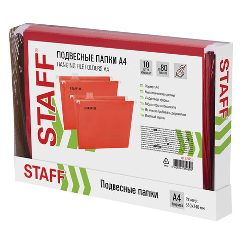 Подвесные папки А4 (350х240 мм) до 80 л., КОМПЛЕКТ 10 шт., красные, картон, STAFF, 270931