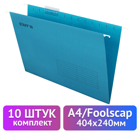 Подвесные папки А4/Foolscap (404х240 мм) до 80 л., КОМПЛЕКТ 10 шт., синие, картон, STAFF, 270933