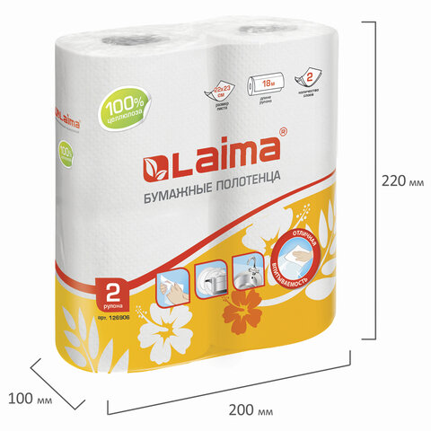 Полотенца бумажные бытовые, спайка 2 шт., 2-х слойные, (2х18 м), LAIMA, 22х23 см, белые, 126906