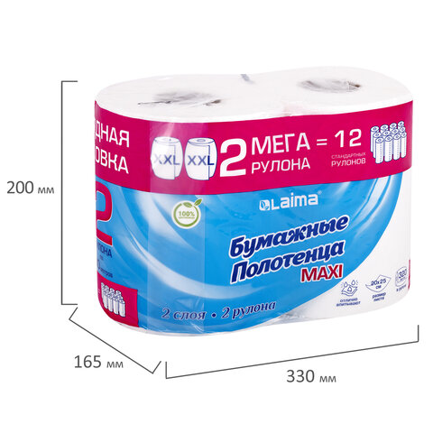 Полотенца бумажные спайка 2 рулона по 80 метров, LAIMA МЕГА РУЛОН, 2 слоя, 20х25 см, 100% целлюлоза, 116377