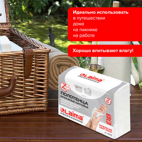 Полотенца бумажные (1 пачка 190 листов) LAIMA (H2) PREMIUM UNIT PACK, белые, 22,5х21,5 см, Z-сложение, 126559