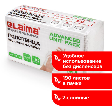Полотенца бумажные (1 пачка 190 листов) LAIMA (Система H2) ADVANCED UNIT PACK, 2-слойные, 24х21,6 см, Z-сложение, 112138