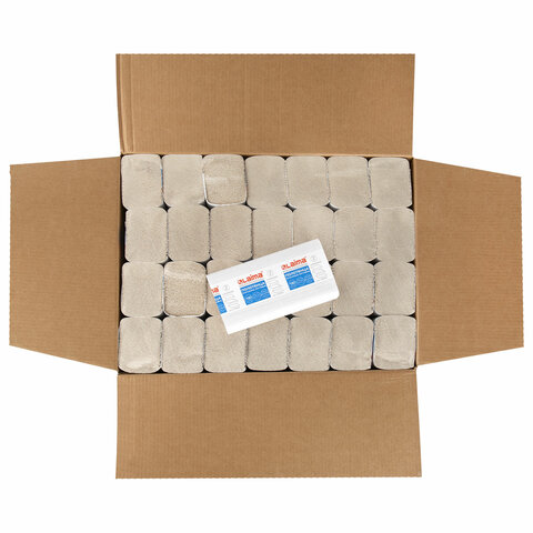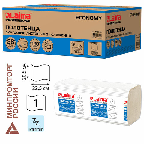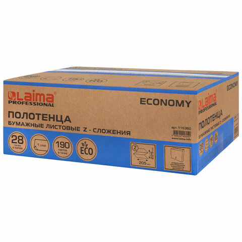 Полотенца бумажные 190 шт., КОМПЛЕКТ 28 пачек, LAIMA ECONOMY (H2), Z-сложение, натуральный цвет, 22,5х20,5 см, 115360