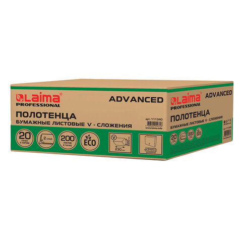 Полотенца бумажные 200 шт., LAIMA (H3) ADVANCED, 2-слойные, белые, КОМПЛЕКТ 20 пачек, 22х23, V-сложение, 111340