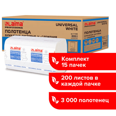 Полотенца бумажные 200 шт., LAIMA (H3) UNIVERSAL WHITE, 1-слойные, белые, КОМПЛЕКТ 15 пачек, 23x20,5, V-сложение, 111342