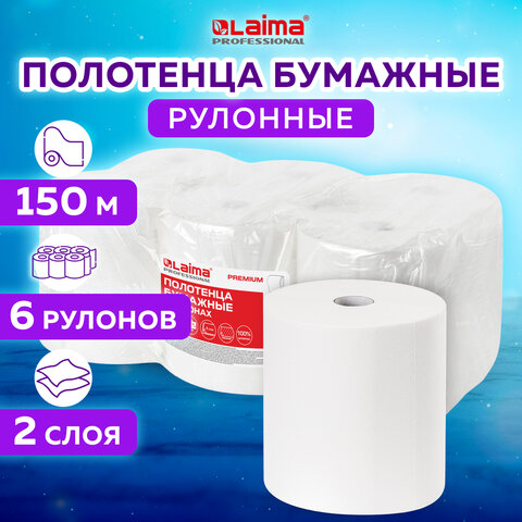 Полотенца бумажные рулонные 150 м, LAIMA (Система H1) PREMIUM, 2-слойные, белые, КОМПЛЕКТ 6 рулонов, 112505