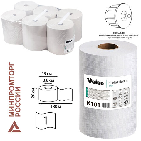 Полотенца бумажные рулонные 180 м, VEIRO (Система H1) BASIC, 1-слойные, цвет натуральный, КОМПЛЕКТ 6 рулонов, K101