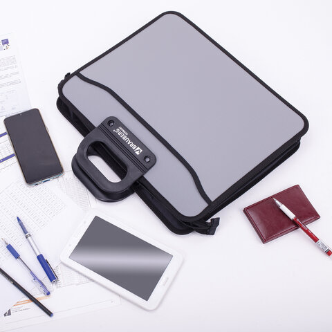 Папка-портфель пластиковая BRAUBERG ПРЕМЬЕР А4 (390х315х120 мм), 3 отделения, фактура "бисер", серая, 223083