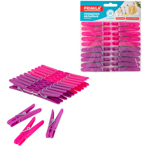 Прищепки бельевые 6,8 см, КОМПЛЕКТ 20 штук, пластик, ассорти, PRIMILA (ПРИМИЛА) COMPACT, 700520