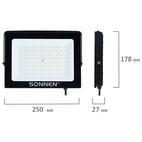 Прожектор светодиодный 100 Вт, 6500 К, 8000 Лм, 100 м2, IP65, 250x178x27 мм, черный, SONNEN, 238415