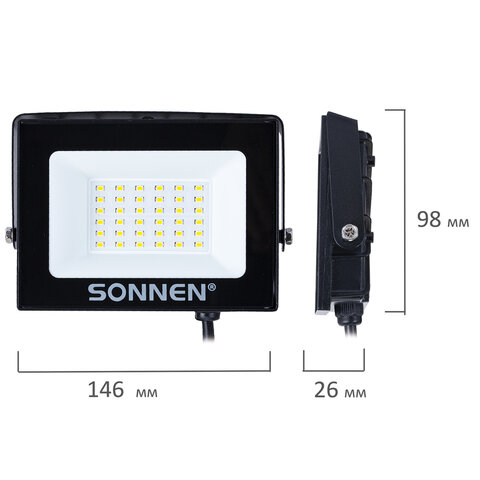 Прожектор светодиодный 30 Вт, 6500 К, 2400 Лм, 30 м2, IP65, 146x98x26 мм, черный, SONNEN, 238413