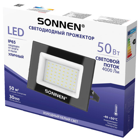 Прожектор светодиодный 50 Вт, 6500 К, 4000 Лм, 50 м2, IP65, 176x123x26 мм, черный, SONNEN, 238414
