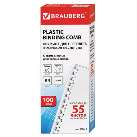Пружины пластиковые для переплета, КОМПЛЕКТ 100 шт., 10 мм (для сшивания 41-55 л.), белые, BRAUBERG, 530812