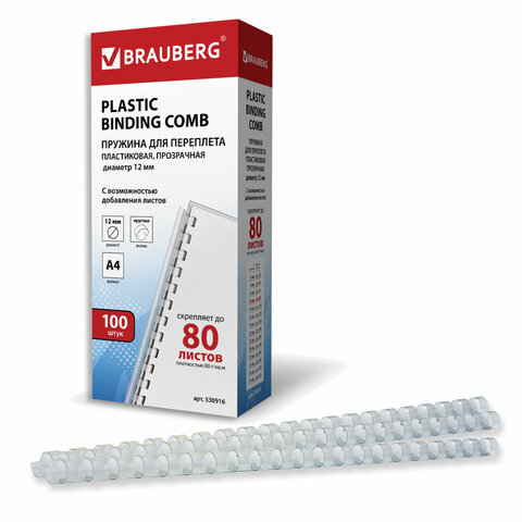 Пружины пластиковые для переплета, КОМПЛЕКТ 100 шт., 12 мм (для сшивания 56-80 л.), прозрачные, BRAUBERG, 530916