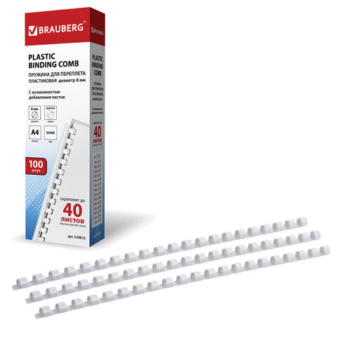 Пружины пластиковые для переплета, КОМПЛЕКТ 100 штук, 8 мм (для сшивания 21-40 листов), белые, BRAUBERG, 530810