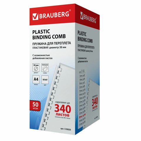 Пружины пластиковые для переплета, КОМПЛЕКТ 50 шт., 38 мм (для сшивания 281-340 л.), белые, BRAUBERG, 530820