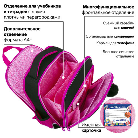 Ранец BRAUBERG QUADRO, 3 отделения, с брелоком, "Black cat", 37х28х18 см, 271358