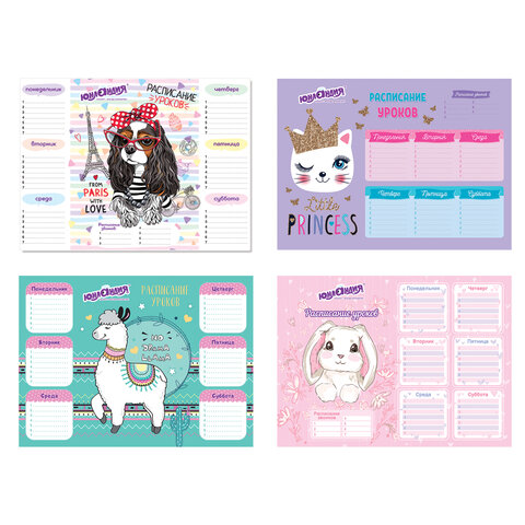 Расписание уроков и звонков А4, ЮНЛАНДИЯ, "Весёлые зверята", ассорти (4 вида), 111655