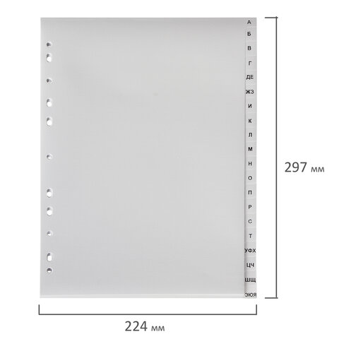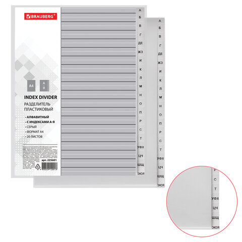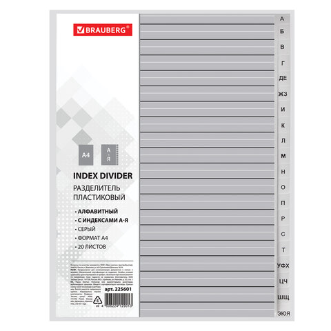 Разделитель пластиковый BRAUBERG, А4, 20 листов, алфавитный А-Я, оглавление, серый, РОССИЯ, 225601